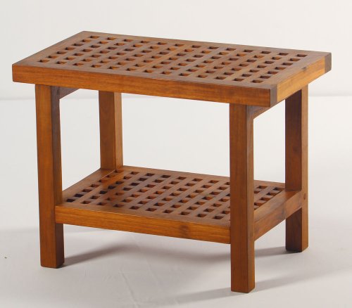NEW! Grate style solid teak spa stools with shelf, ideal for the patio, bathroom, shower, deck, patio, or pool deck. Similar units sell for up to 9. This is solid teak wood construction. The bench is almost 24" x 13" x 18" providing the ideal mix of a large size with a compact footprint to fit in your shower. This is also great for outdoor use as a table for the patio, pool, deck, or garden.
