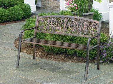 "Assembled dimensions: 50.3"" x 24"" x 34"" Ace exclusive Sturdy steel tube framing Brushed bronze color Iron back ""Welcome"" inlay in back of bench Exclusive artwork by R.A. Guthrie "