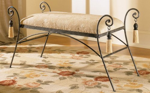 Beautifully styled iron accent bench of steel tubing and solid wire with elegant scroll work. Features a lustrous black/pewter hand washed epoxy finish to compliment the thickly upholstered seat with tone-on-tone chenille damask pattern. There are four matching tassels attached to the scroll legs. Minor assembly required.
